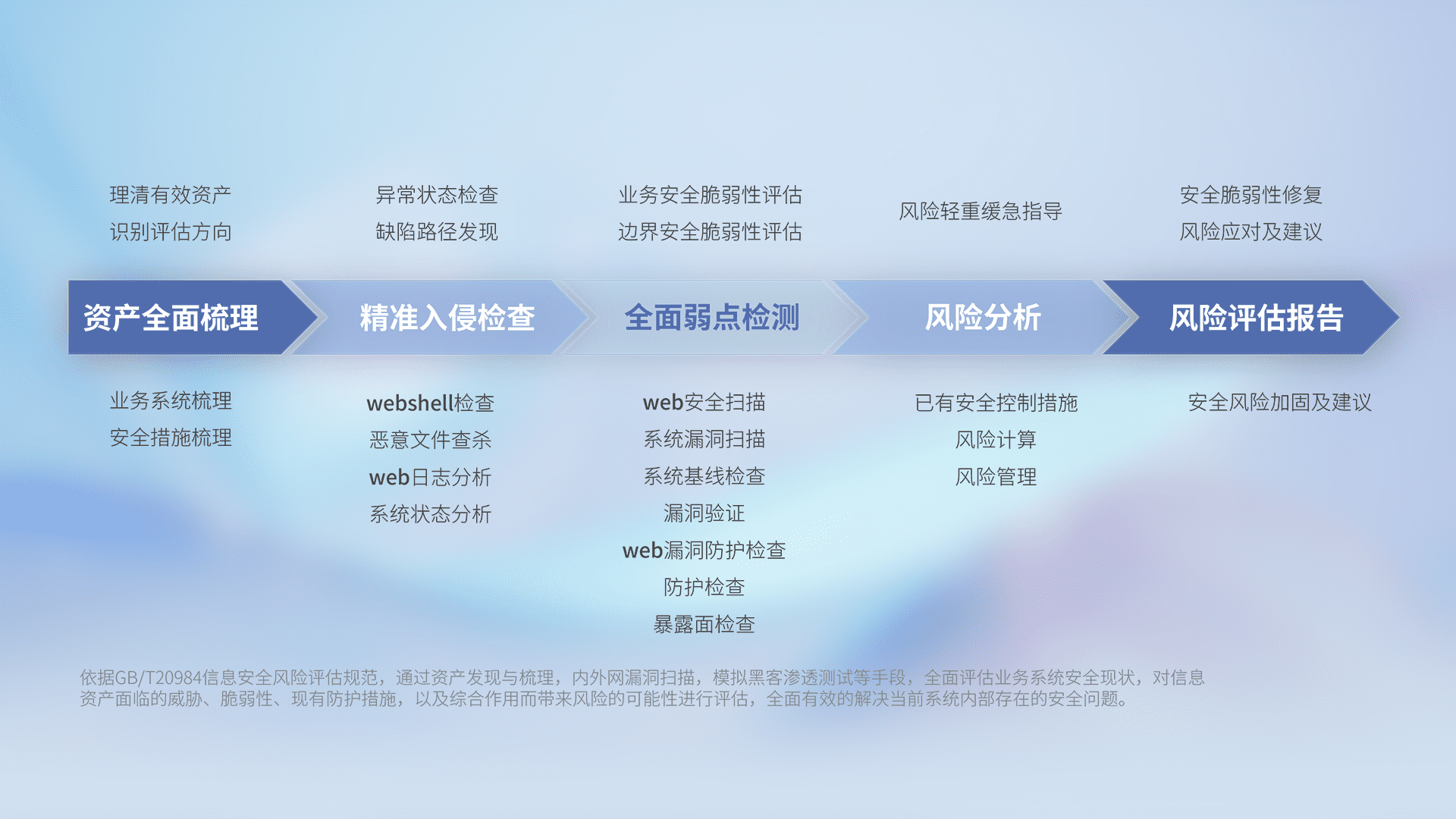 针对客户行业特性,,,,以专业的安全服务+多厂商联合解决方案提供专属的一站式安全管理服务,,帮助客户全面感知网络空间威胁,,,基于识别、、、、检测、、、分析、、、防护、、、、监测、、、响应的服务理论模型,,从方案咨询、、、、集成交付、、评估验证、、优化加固、、运维运营,,,致力于为客户提供完整的闭环管理式安全服务。。。。以实战经验为客户打造高抵御风险的安全体系,,帮助客户发现威胁、、对抗威胁、、处置威胁,,,,不断积累安全对抗能力,,,持续保障数字化安全。。